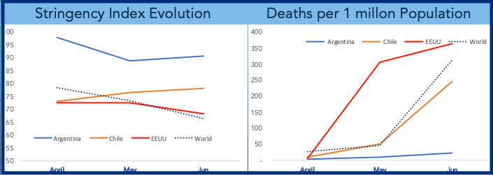 - In terms of Containment, Argentina presents the highest level when compares against Chile and USA. This is also reflected in the Stringency Index.